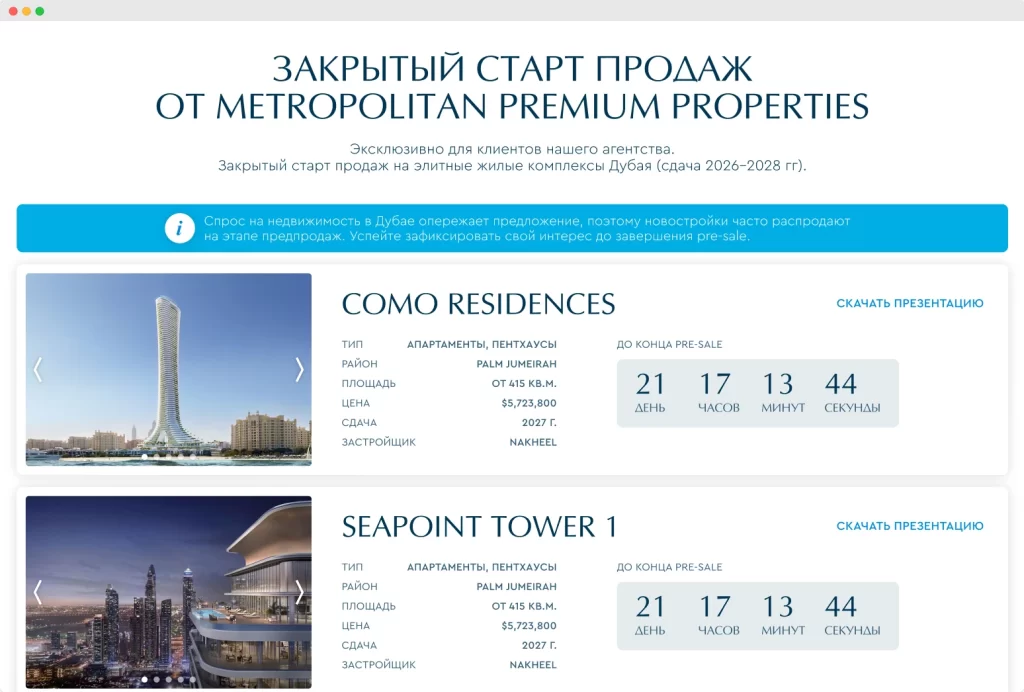 Landing-page с актуальными предложениями и позиционированием агентства недвижимости Metropolitan Premium Properties, как надежного партнера.