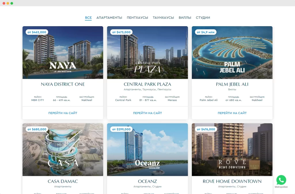 В качестве целевой страницы для этой аудитории был разработан лендинг с комбинированным контентом. На странице представлен ассортимент новых жилых комплексов, доступных к покупке. Также представлена информация об агентстве недвижимости Metropolitan Premium Properties, как об авторитетном, надежном и достойном доверия брокере.