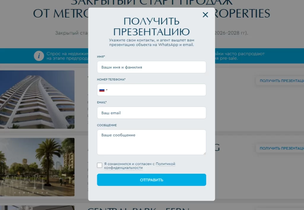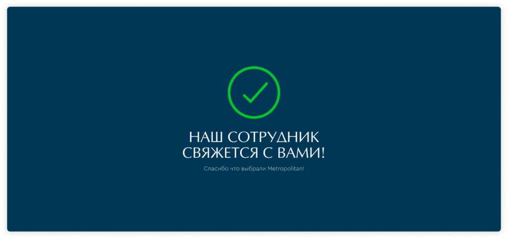 Дизайн landing-page разработан с использованием фирменного стиля и брендирования Metropolitan Premium Properties. Это создает ощущение “знакомости” у клиентов, которые ранее уже встречались с рекламными кампаниями агентства.