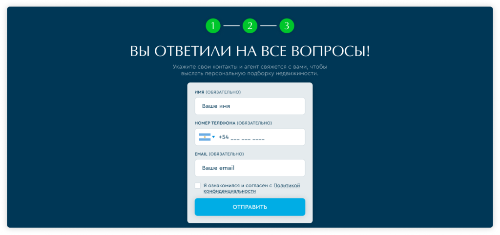 Этап верстки и настройки занял ½ времени работы над проектом, так как требовалось реализовать динамические элементы и несколько типов форм обратной связи. Затем выполнили настройку всех форм таким образом, чтобы информация о лиде (его контакты, гео, “точка входа” и другие данные) направлялась в CRM агентства.